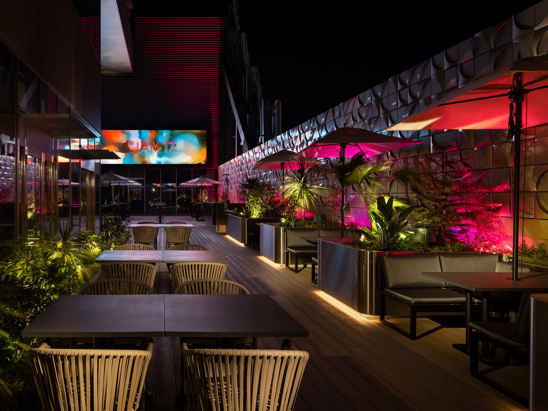 JAM17 BARは、バーテンダーとの会話も楽しめる店内のカウンター席のほか、夏の夜風も心地よいテラス席もご利用いただくことが可能。ディナー前のお待ち合わせや二次会など、夏の夜を思い思いにお過ごしいただけます。