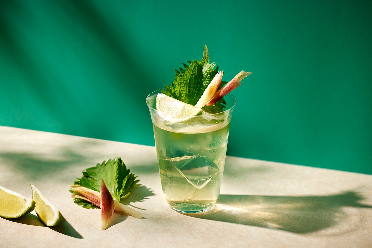 スペイン語で悪魔という名の赤いカクテル「ディアブロ」を、ミョウガや大葉など日本の薬味でアレンジしました。