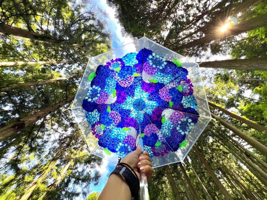 雨の日を美しいグラデーションで彩る紫陽花を、空いっぱいに広げて思う存分堪能できる傘です。繊細で、ていねいに描かれた紫陽花のリアルなイラストを透明傘にのせているので、外から見れば紫陽花の花束のよう。内側から見上げれば、まるで紫陽花が空から咲きこぼれてくるような気分が味わえます。