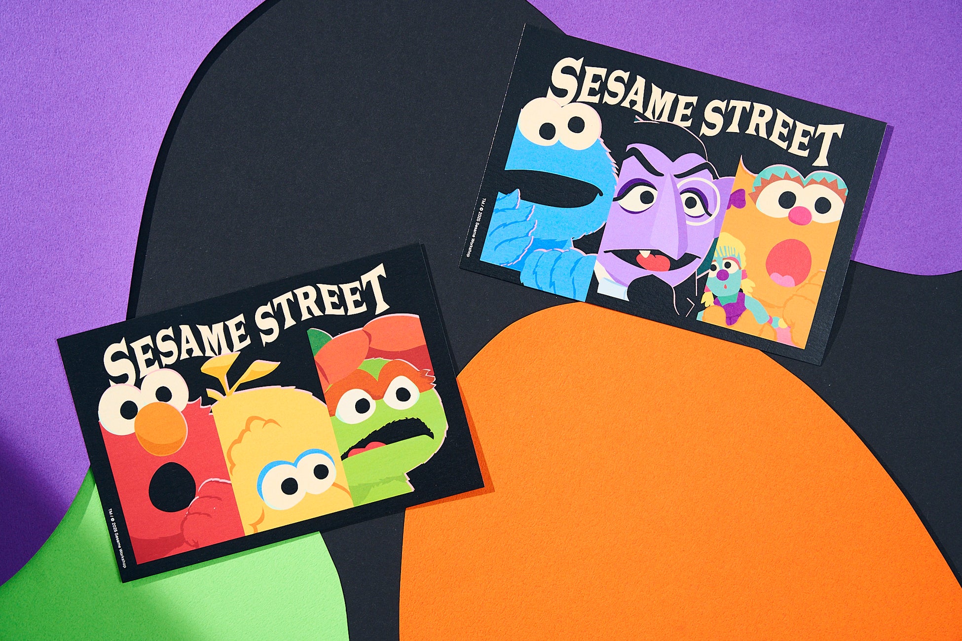 毎回大好評のポストカード。今回は、セサミストリートの仲間たちの驚いた表情に大胆にフォーカスした2種類のデザインをご用意しました。黒のベースカラーに映えるキャラクターたちのカラフルなカラーリングと「SESAME STREET」のロゴデザインが、ハロウィンにぴったりの一枚です。