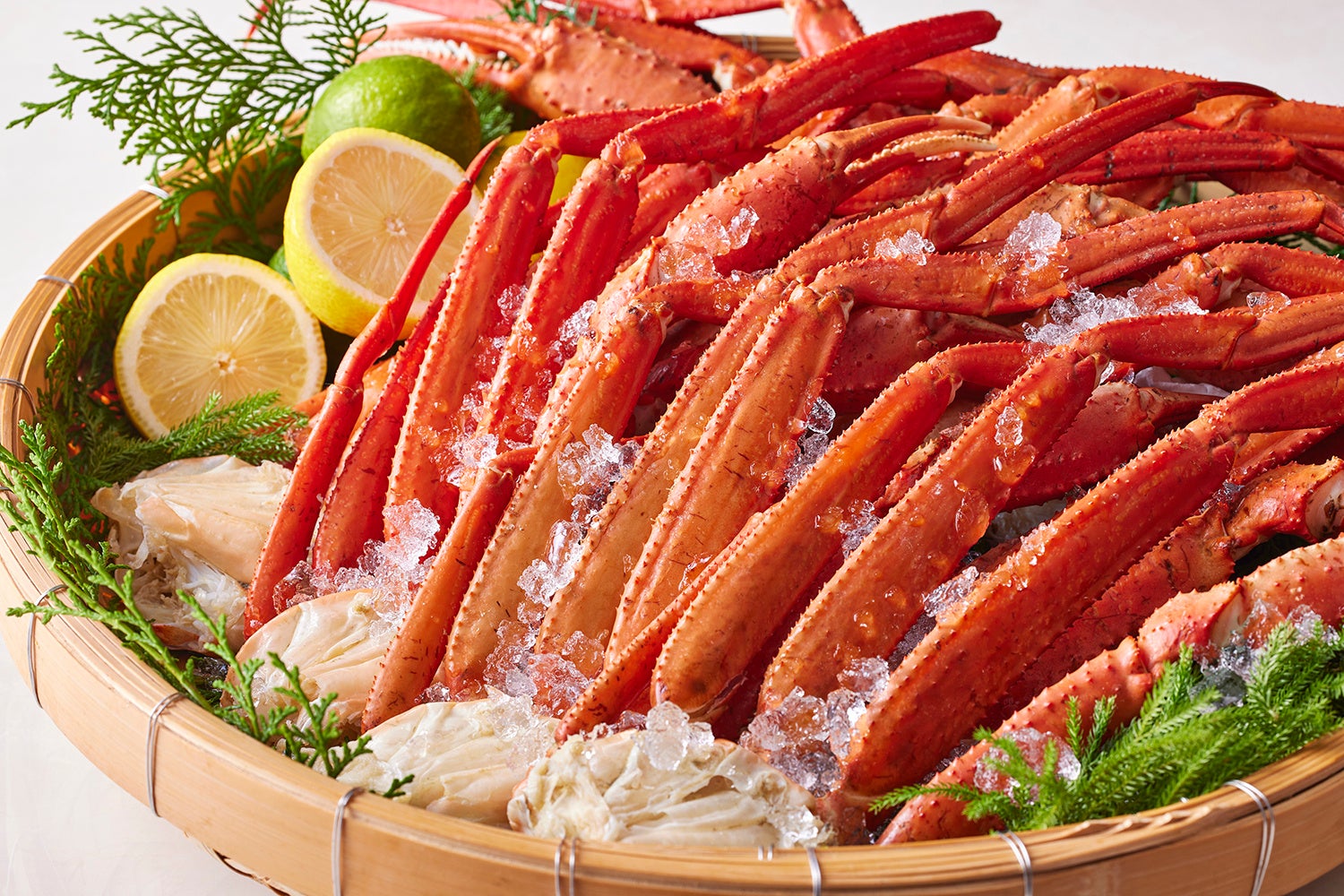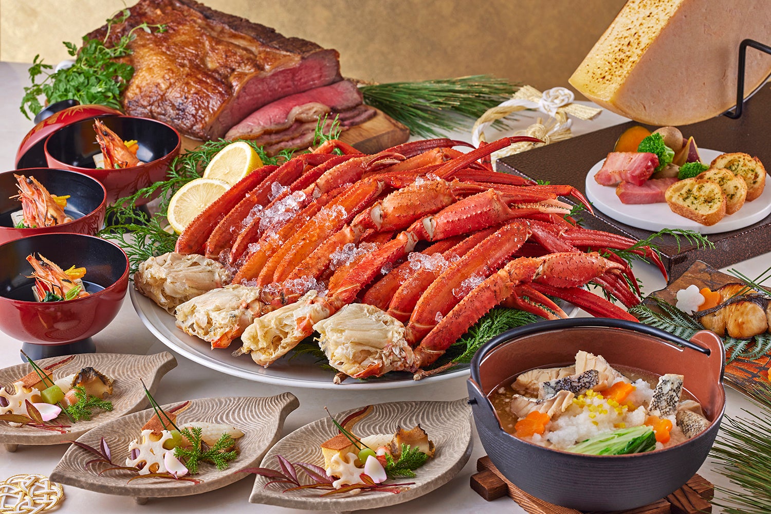 ブッフェテーブルには、甘みのある身がしっかりと詰まった「本ズワイガニ」の食べ放題をはじめ、ジューシーに焼き上げた牛肉を3種のソースで楽しめる「牛肉のグリルステーキ」「昆布〆ブリたたきのカルパッチョ仕立て」などの洋食から、胡麻味噌仕立ての「鮟鱇鍋」や「祝肴」「おせち料理」などの日本料理、「苺のショートケーキ」「黒ゴマプリン」などのデザートまで、豪華なメニューがずらりと並びます。