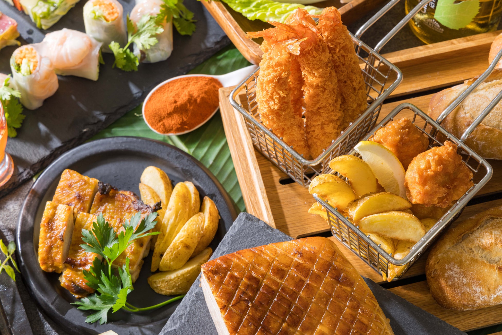<カジュアルブッフェメニュー>白身魚のエスカベーシュとキノコ、春雨サラダ アジアンフレーバー、ソフト生ハムとオニオンのマリネ風、キヌアとチキンのサラダ、エリンギとオクラのピクルス風、ミックスグレインズサラダ、ロールキャベツの煮込み トマトガーリックソース、鶏のベニエ風 スィートチリソース&タルタルソース添え、オリジナルピラフ チャイニーズ風、オニオンカレー&スチームライス、本日のスープ、シェフおすすめデザート各種