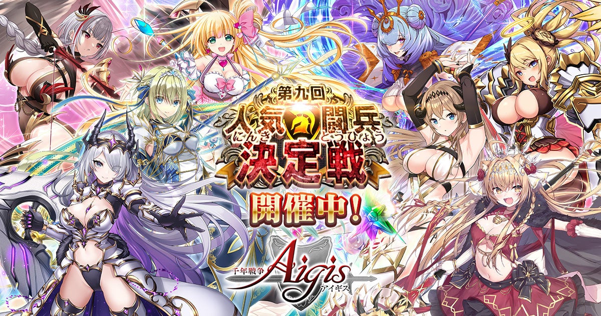 「第九回人気闘兵決定戦」開催中に千年戦争アイギス公式アカウント(@Aigis1000)にて記念ツイートを配信いたします。千年戦争アイギス公式アカウントをフォローし、記念ツイートをリツイートしていただくと、リツイート数に応じて報酬をプレゼントいたします。是非ご参加下さい。