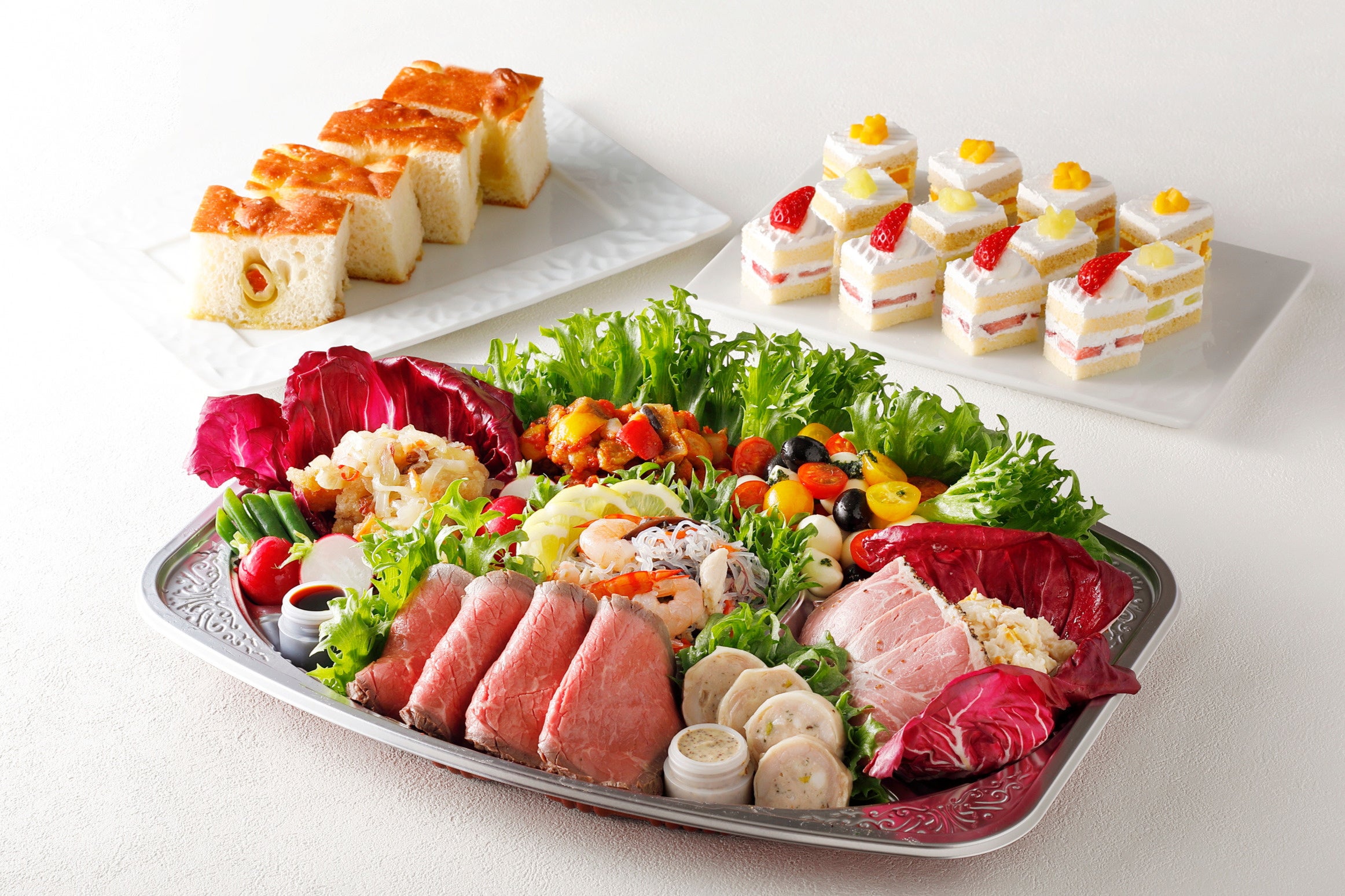 花火鑑賞をより一層盛り上げるオードブルには、ビールやワイン、シャンパーニュなどのお酒にぴったりなメニューを豊富に揃えました。旨みあふれる「ローストビーフ 和風ソース」をはじめ、夏にさっぱりといただける「白身魚のエスカベッシュ」や「スモークポテトサラダ」など、彩り豊かな本格ディナーをご堪能いただけます。 さらに食後のデザートには、ホテルニューオータニの代名詞とも言える究極のスイーツ「スーパーメロンショートケーキ」に加え、季節感あふれる「マンゴーショートケーキ」など、3種のショートケーキ盛り合わせをご用意。お食事からデザートまでホテルの贅沢な味わいを丸ごと堪能しながら、夜空を彩る花火と美食の饗宴をお愉しみください。