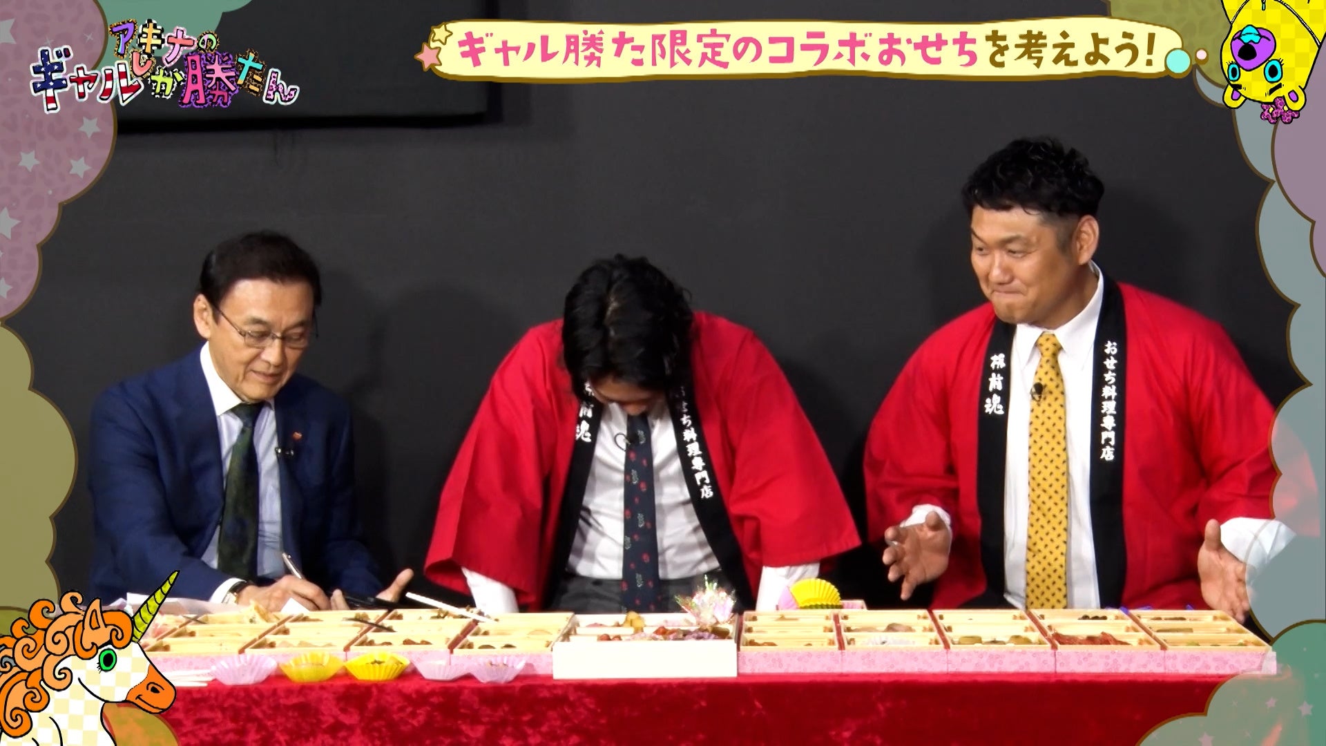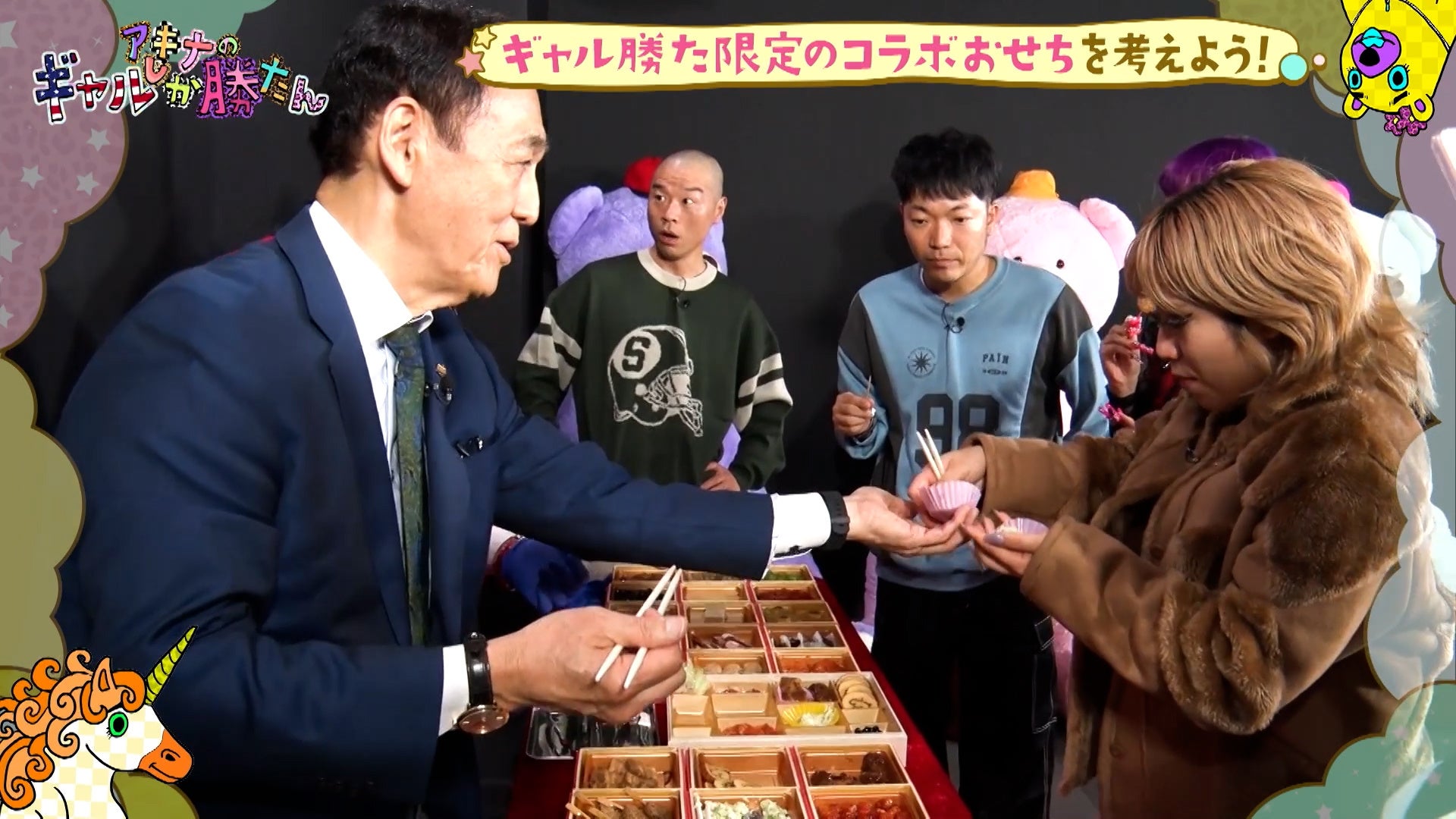 番組収録に集まったギャル達と真剣に意見交換をしながら、史上初(!?)のギャルが考えたコンセプトおせち『板前魂とアキナのギャルしか勝たんコラボおせち』が完成しました。