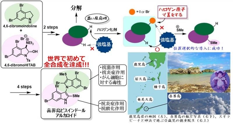 喜界島ビスインドールアルカロイドは、2005年に鹿児島県喜界島にて採取された紅藻ソゾノハナLaurencia brongniartiiから単離された天然物であり、構築の難しいC3’N1ビスインドールを持ち、高い反応性を持つ硫黄ユニットや臭素を複数持つ合成最難関化合物の一つで、全合成は未達成でした。