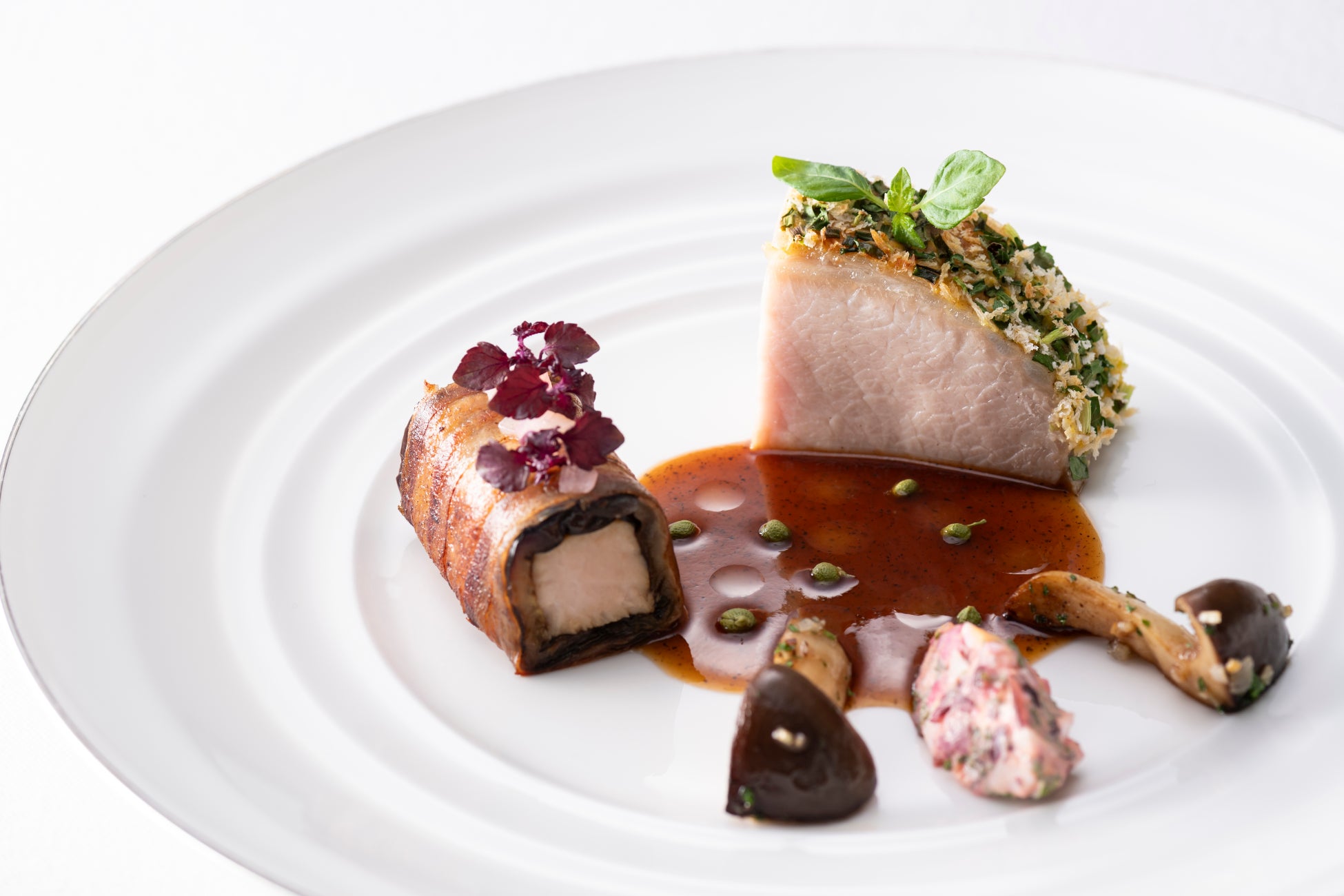 ローストポークの京番茶燻る和香草パン粉焼きと茄子とパンチェッタのルロー 実山椒と京漬物のコンディマン