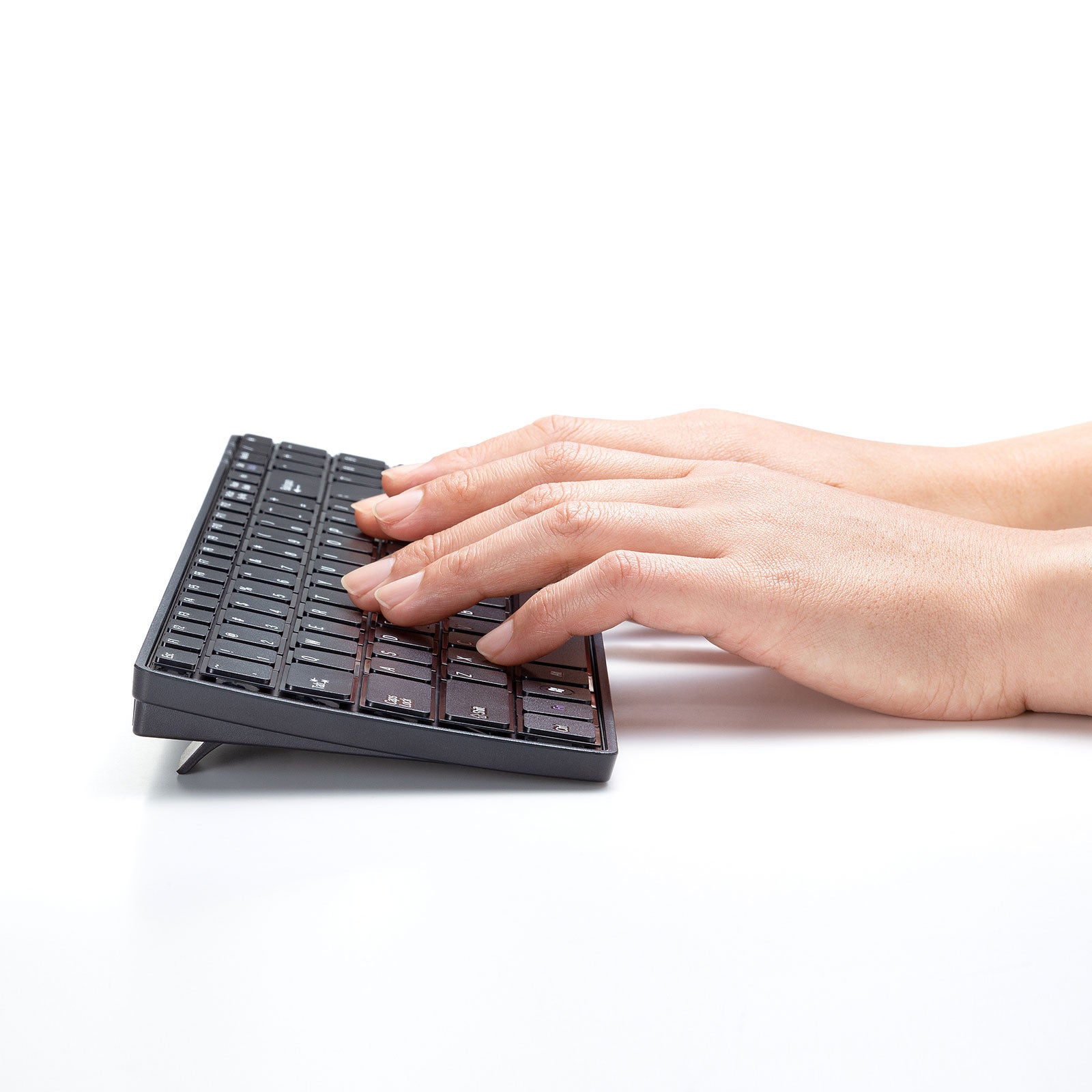 余分なキーを省いたシンプルなキーボードで、幅345mでテンキーを配置した省スペースデザインです。使わない時はキーボードを立てて収納できます。
