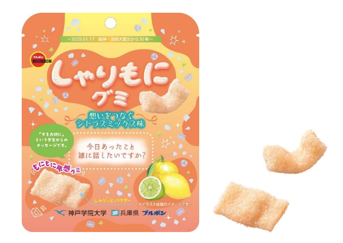 (株)ブルボンの「しゃりもにグミ」シリーズに、甘くて少し酸っぱいシトラスミックス味が加わりました。パッケージの表面には、震災を知らない若年層に向けて、学生が意見を出し合って考案した震災を風化させず「何気ない日々は当たり前ではなく、1日1日を大切に生きて行こう」という日常に寄り添うポジティブなメッセージ(8パターン)を取り入れました。また、裏面は兵庫県が開設している震災30年特設ホームページにアクセスできる二次元コードを掲載しています。