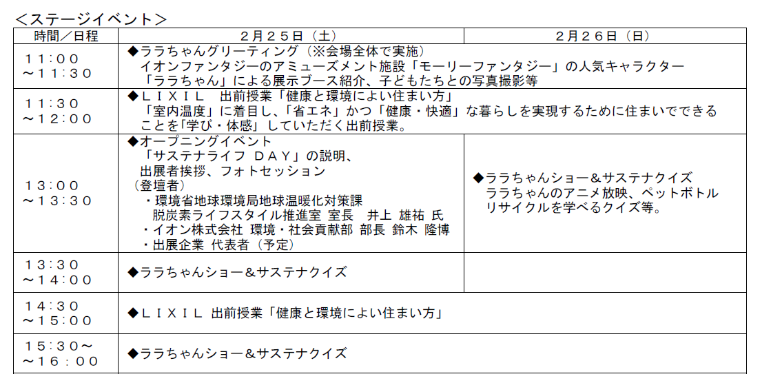 イオンは、2月25日(土)26日(日)の2日間、大阪府堺市のイオンモール堺北花田にて、環境省と共同で、脱炭素につながるライフスタイルを提案するイベント「サステナライフ DAY~脱炭素de豊かな暮らし~」(以下、本イベント)を開催いたします。