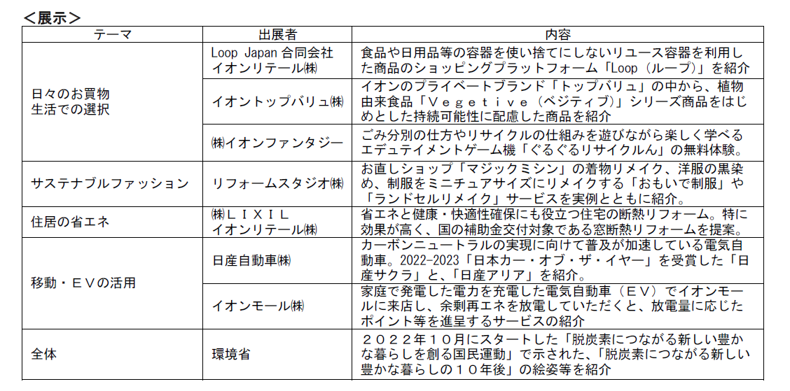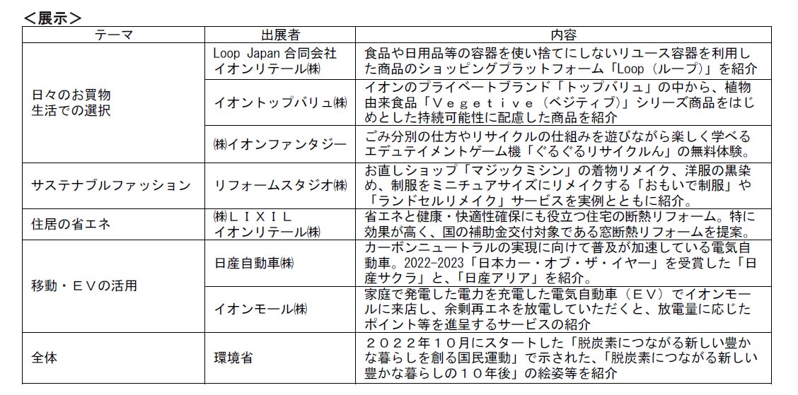 イオンは、2022年10月に環境省が立ち上げた「脱炭素につながる新しい豊かな暮らしを創る国民運動※3」および、官民連携で国民・消費者の行動変容、ライフスタイルの変革を後押しすることを目的に発足した「新国民運動官民連携協議会※4」に参画しています。本イベントはこうした動きとも連動するものであり、今後もより多くのお客さまに脱炭素につながる商品やサービスを体感いただける場を提供していきます。
