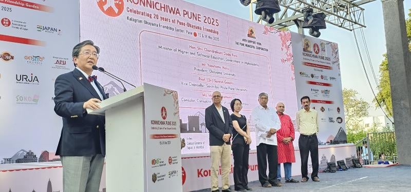 さらに、那須学長はAFJおよびプネ市のサポートの下、在ムンバイ日本国総領事および印日ビジネス協議会(IJBC)の共催により、プネ岡山友好公園で開催された文化事業「Konnichiwa Pune2025(こんにちはプネ2025)」にも参加し、スピーチを行いました。同イベントでは、現地大学生による茶道や生け花の実演、日本語の歌唱などが披露され、プネの人たちの日本への関心の高さを実感できました。