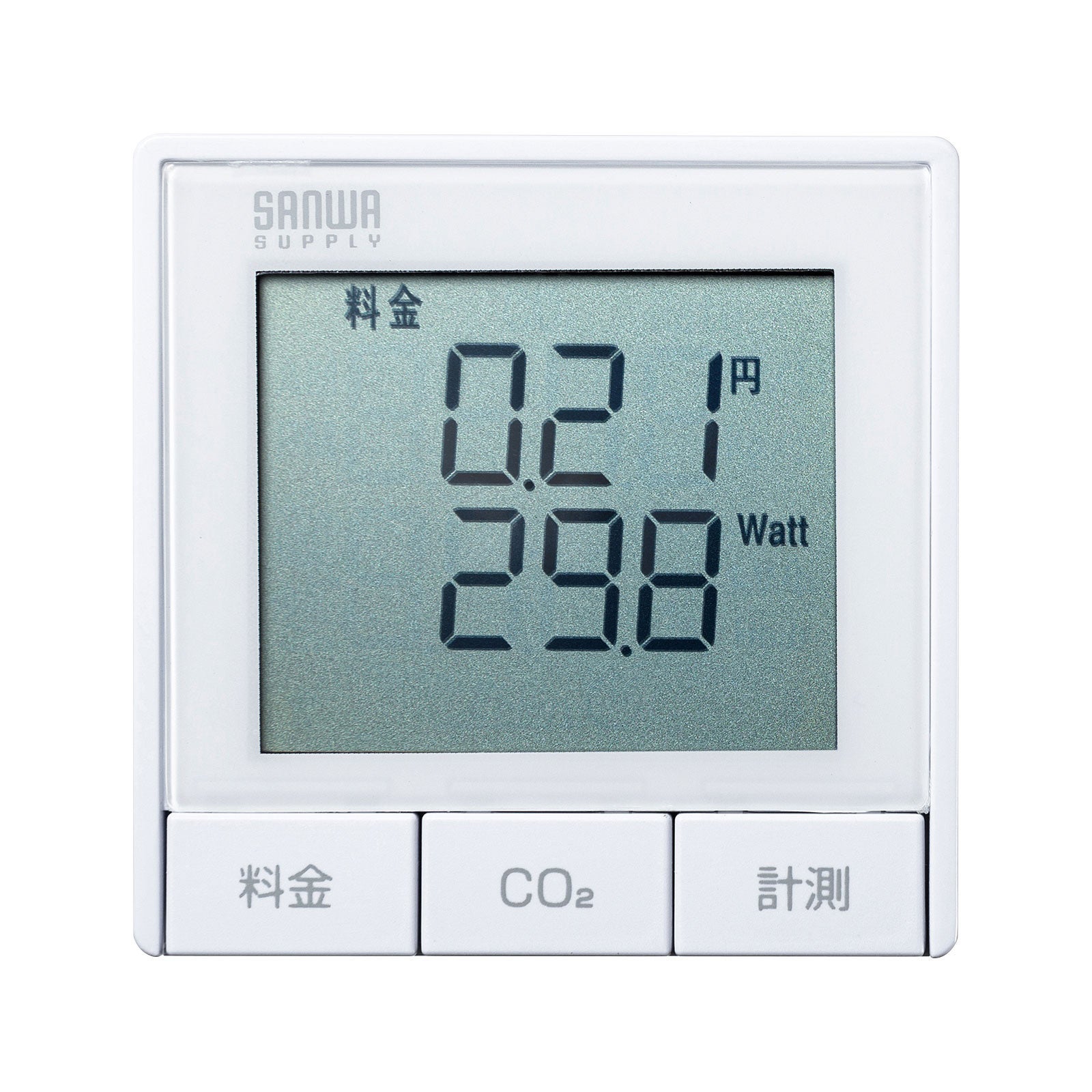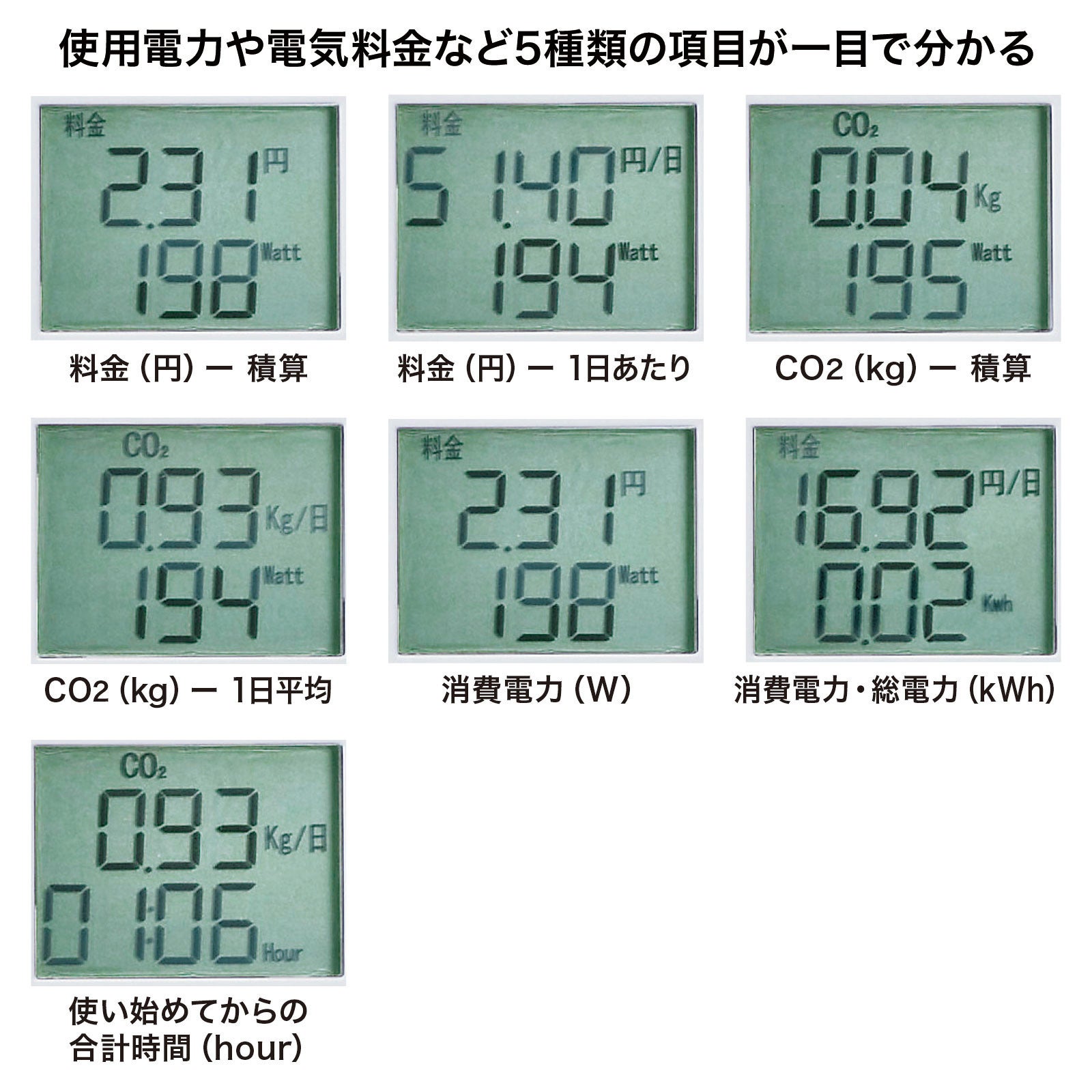 5種類のデータ測定に対応しており、消費電力(W)、積算電力量(kWh)、積算時間(Hour)、積算電力料金(円)、CO2排出量(kg)を表示することができます。