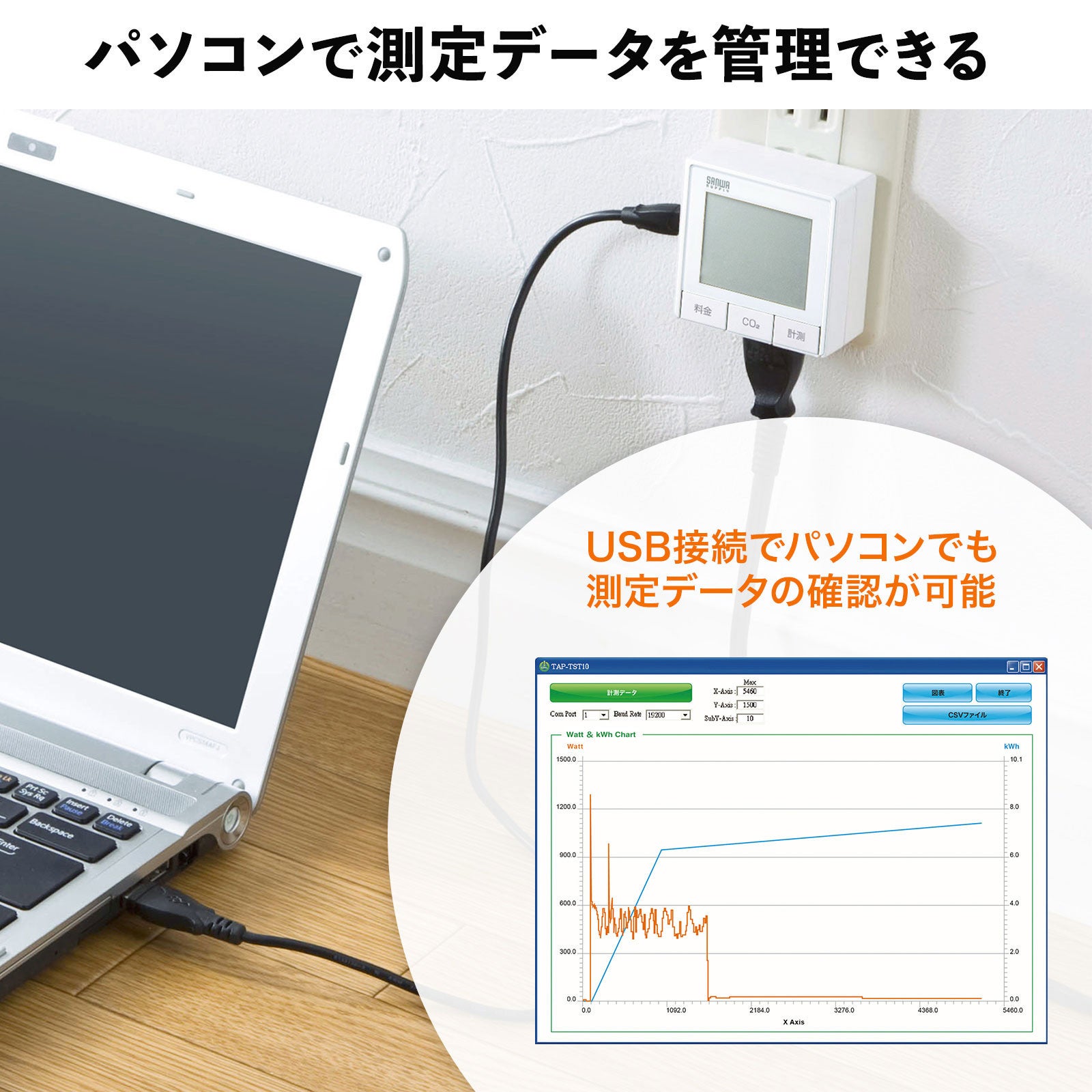 付属のUSBケーブルでパソコンに接続することで、測定データ(消費電力、電力量、時間)を確認でき、データの保存が可能です。計測データ(CSVファイル形式)は10分間隔で約1ヶ月分の計測、保存ができます。