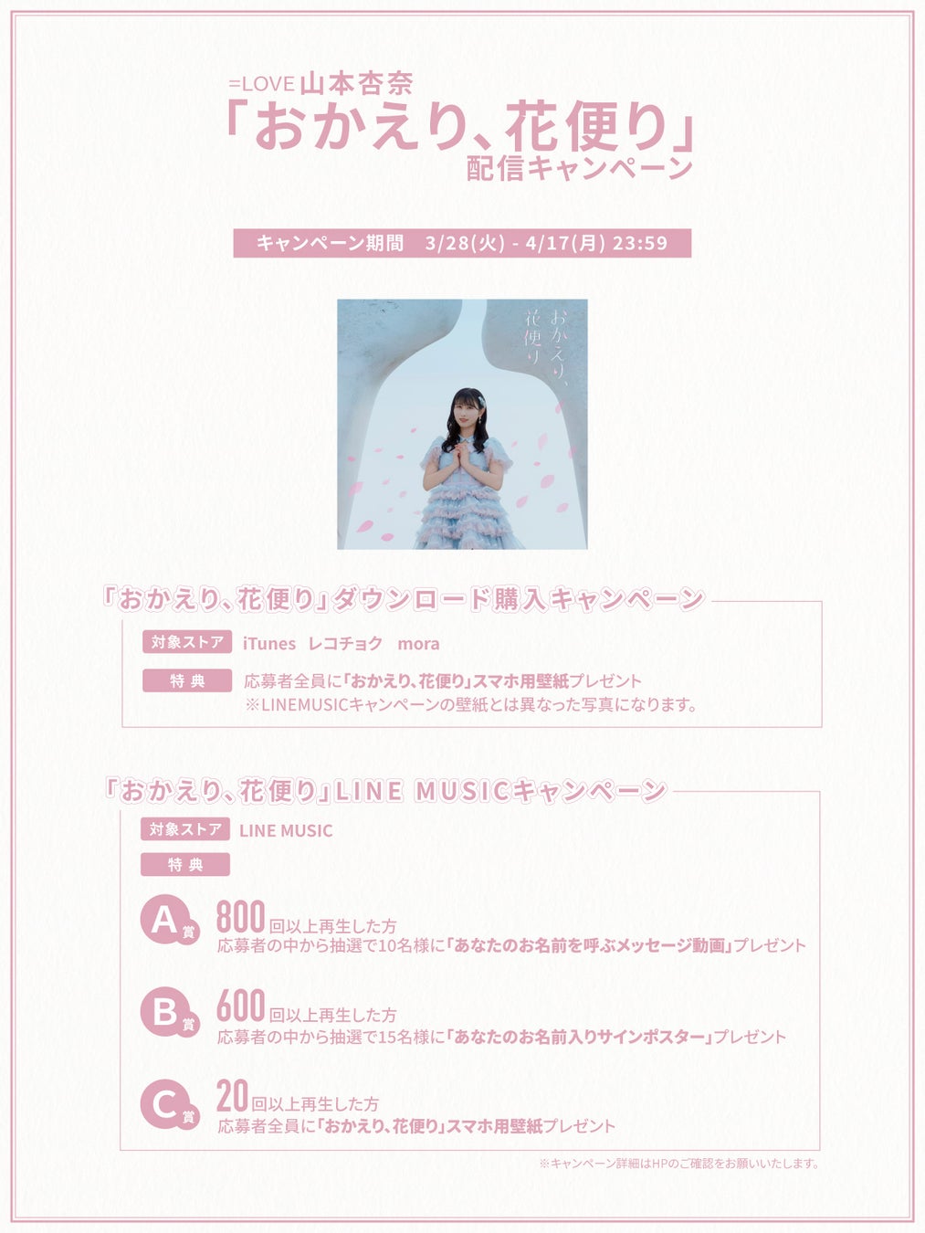 『山本杏奈 ソロ楽曲「おかえり、花便り」配信キャンペーン』として、単曲購入&応募者全員に「おかえり、花便り」スマホ用壁紙がもらえる「ダウンロード購入キャンペーン」、再生回数に応じて応募特典が当たる「LINE MUSICキャンペーン」も配信に合わせて開催されるとのこと。ぜひ、詳細をチェックいただき、当キャンペーンにも奮ってご応募いただきたい。