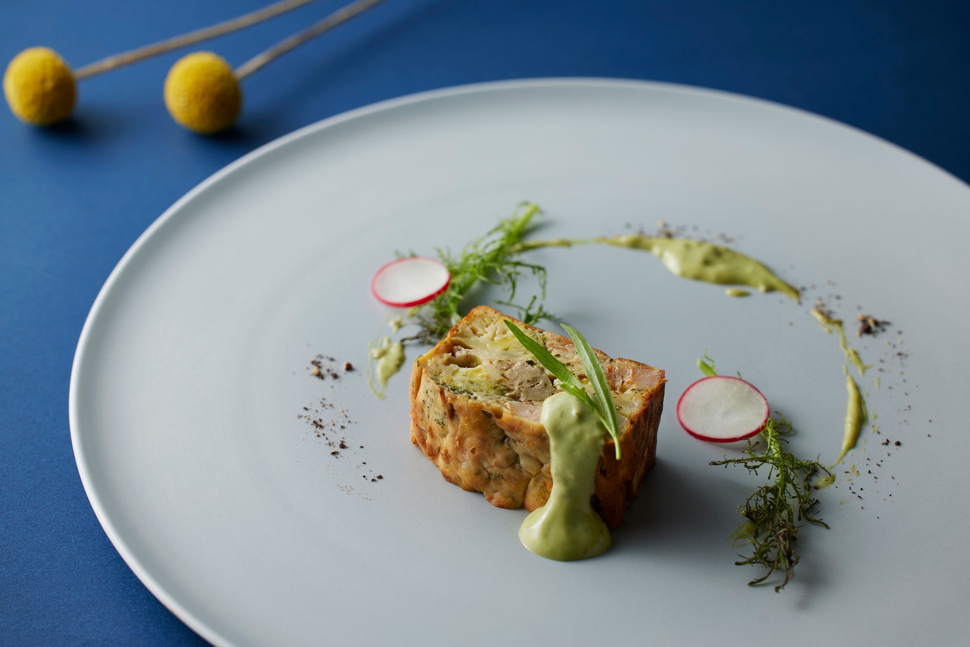 前菜には、しっとりとした食感と深い味わいが魅力の「鶏レバーとポークソーセージのケークサレ エストラゴンマスタードソース」などを週替わりで提供。メインには香ばしく焼き上げ、程よい甘さと清涼感のある香草ソースで味わう「鮟鱇のグリル ペルノ風味のクリームソース」ご用意しました。