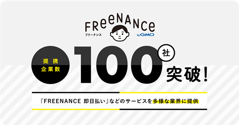 GMOインターネットグループのGMOペパボ株式会社(代表取締役社長:佐藤 健太郎)の連結会社であるGMOクリエイターズネットワーク株式会社(代表取締役社長:伊藤 毅 以下、GMOクリエイターズネットワーク)が提供する日本初(※1)のフリーランス(※2)に特化した金融支援サービス「FREENANCE(フリーナンス) byGMO」(URL:https://freenance.net/)は、提携する企業数が100社を突破いたしました。