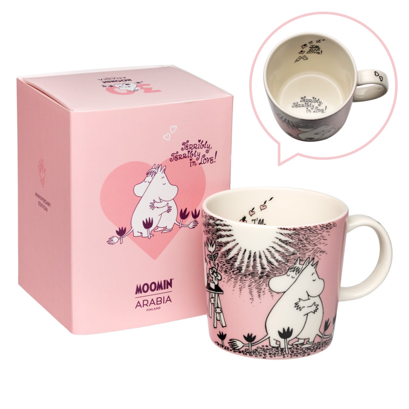 イッタラ 1996年から愛され続けているムーミンアラビアのLoveマグ。30周年を記念したスペシャルエディションは、マグの内側にピンクのハートが舞う中で鼻先を寄せ合うムーミンとスノークのおじょうさんが描かれ、取っ手にも小さなハートがあしらわれています。