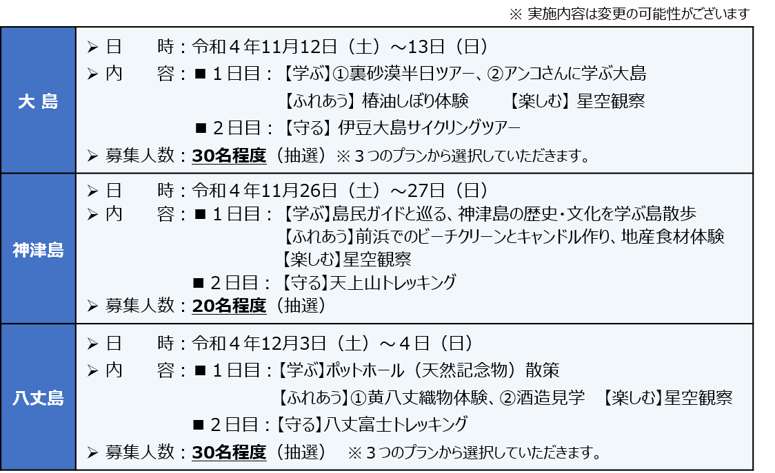 ※ 渡島される方については、ワクチン接種歴(3回以上)又はPCR検査等での陰性が確認できた方が参加対象となります。イベント実施前に必要書類を確認いたしますのでご了承ください。また、各島が公表している「来島者向けのご案内」も必ずご確認ください。