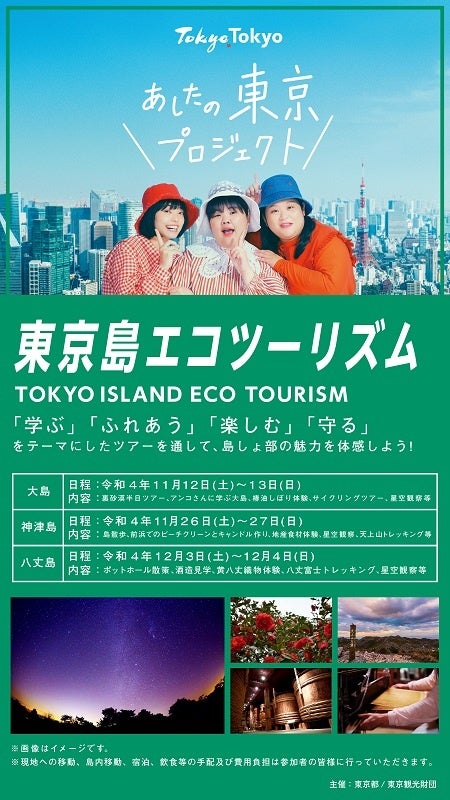 美しい海や豊かな自然に囲まれた東京の島しょ地域で、「学ぶ」、「ふれあう」、「楽しむ」、「守る」をテーマにエコツアーを実施します。地場産業の見学・体験やトレッキング、星空観察などを通して、島しょ地域の魅力を体感していただけるイベントです。