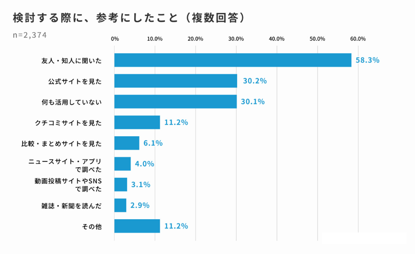 また、インターネットという観点からは、「公式サイトを見た」と回答した保護者も30.2%と、「クチコミサイトを見た(11.2%)」や「比較・まとめサイトを見た(6.1%)」といった回答と比較すると割合が多く、選ぶ段階に関しては公式サイトの情報を参考にすることがわかりました。