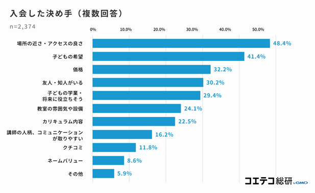 次に多いのが「子どもの希望(41.4%)」、「価格(32.2%)」となりました。通いやすく、子どもが希望する習い事であり、なおかつ料金的にも保護者が納得することが、入会を決める要素となっていることがわかりました。
