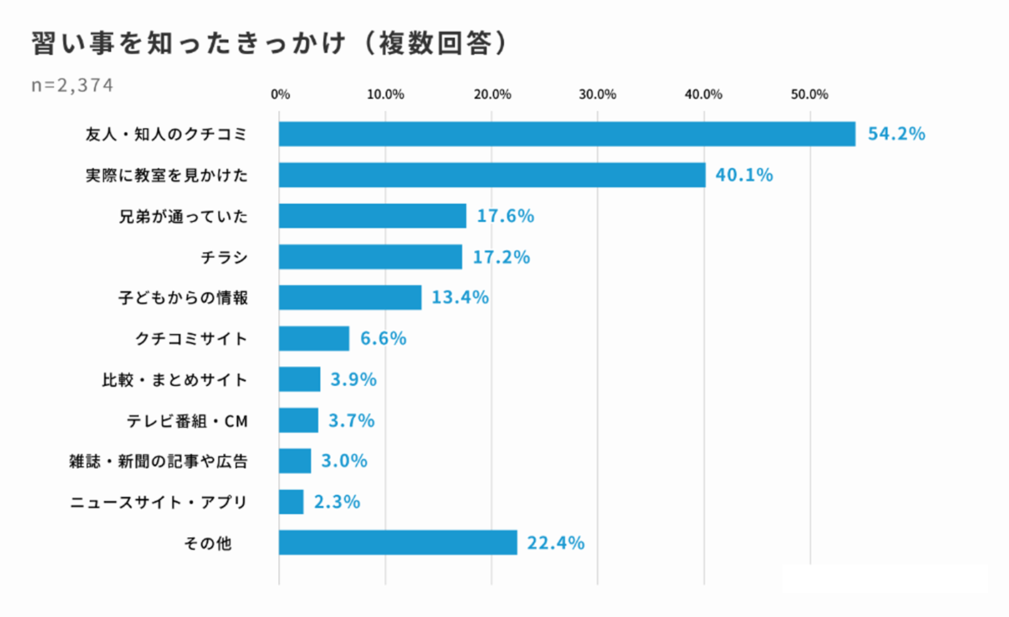 次に、「子どもの習い事を知ったきっかけ」について調査した結果、「友人のクチコミ」で習い事を知った保護者が半数(54.2%)を超え最多となっています。また「実際に教室を見かけた」ことで知った保護者も40.1%にのぼっています。「チラシ(17.2%)」や「子どもからの情報(13.4%)」も含めて、保護者の行動範囲や子どもの活動エリアに教室があり、地域に根づいた情報で習い事について知った保護者が多い傾向です。