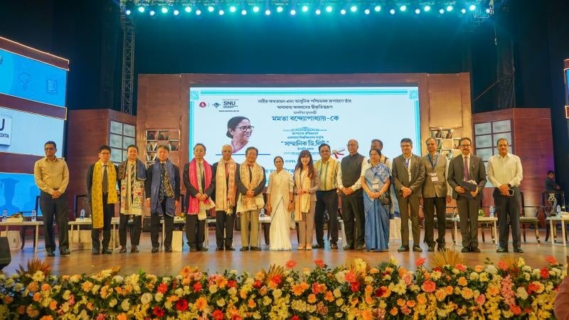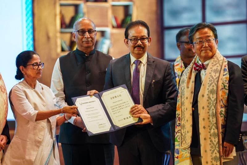 国立大学法人岡山大学(本部:岡山市北区、学長:那須保友)は、2025年11月12日、インド共和国西ベンガル州コルカタ市において、西ベンガル州のママタ・バナルジー首相に名誉博士称号を付与しました。これは、アジア出身の女性として本学初の付与となります。付与式では、約2,000人の政府関係者、教育関係者、市民らが見守る中、那須保友学長が名誉博士記をママタ首相に手渡しました。