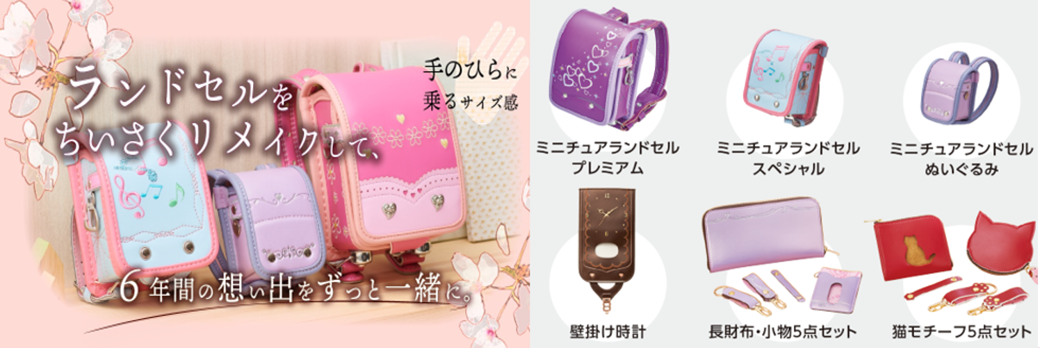 新たなランドセルリメイクとして「壁掛け時計」「長財布・小物5点セット」「猫モチーフ5点セット」「ミニチュアランドセルぬいぐるみ」をマジックミシン、リアット!の全店舗で展開拡大します。
