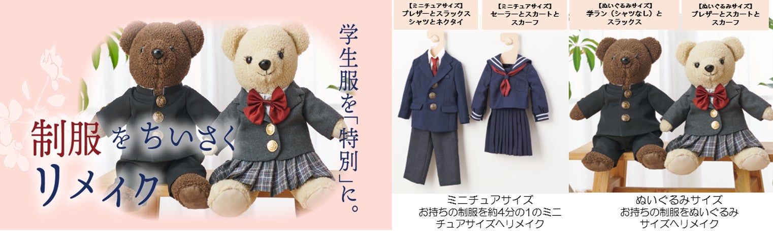 大切な学生生活をともに過ごした学生服のリメイクサービスにミニチュアサイズほか、新たに「ぬいぐるみサイズ」を加えてマジックミシン全店で展開拡大します。お持ちのぬいぐるみに想い出の制服を着せていただくことでずっと一緒の「特別」に変わるリメイクサービスです。