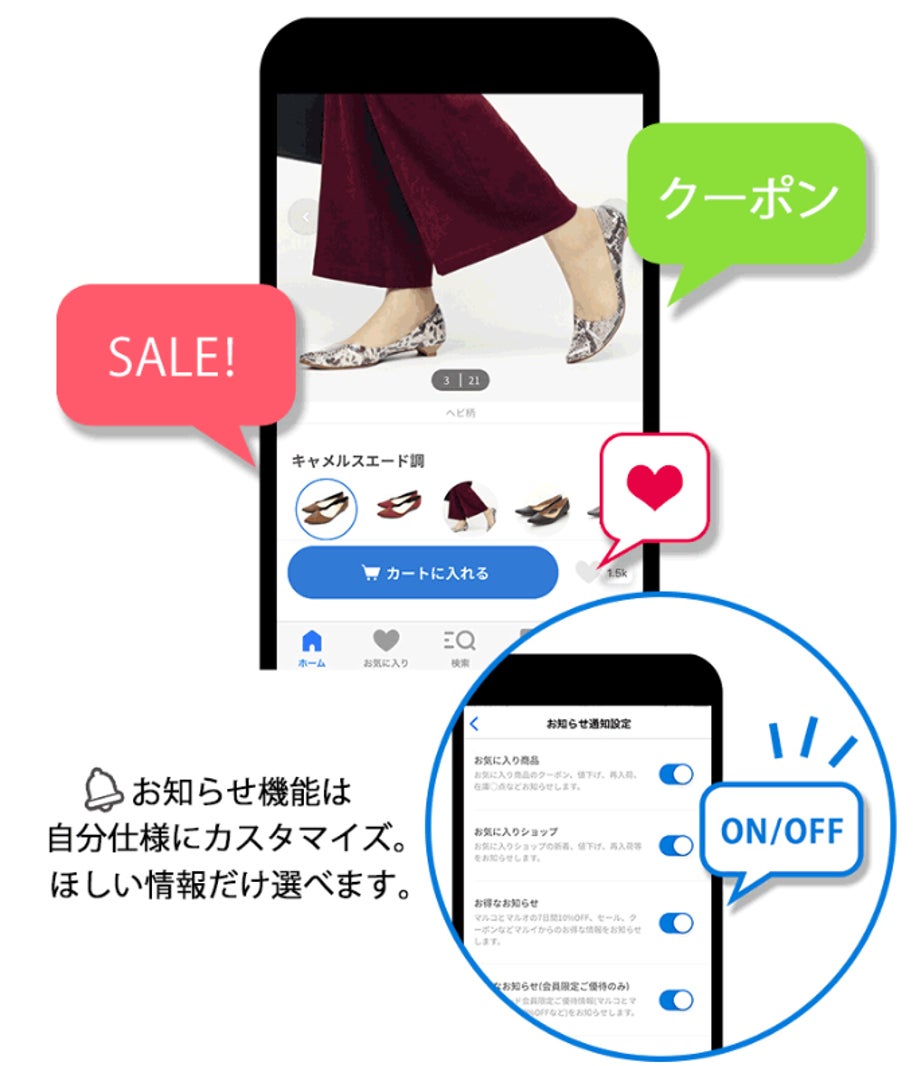 さらに、マルイショッピングアプリをダウンロード&アプリの通知ONにしていただくと、お気に入り登録したショップやアイテムのおトク情報をお知らせします。ネット通販限定『マルコとマルオの3日間』の期間中に見逃したくない「わずか1点」「クーポン対象」などの情報をお知らせいたしますので、通知設定をお忘れなく!
