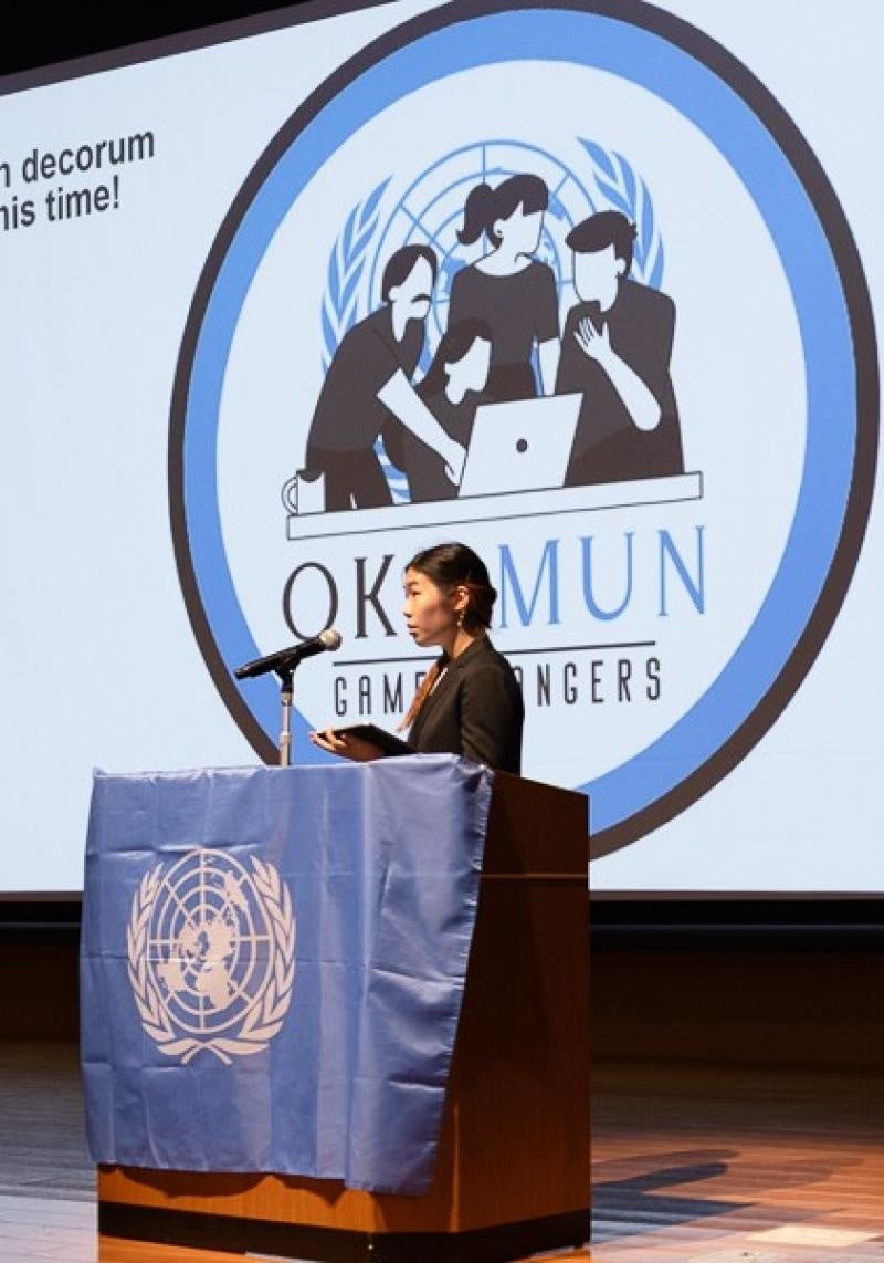 OKAMUNの本学での開催は今回が初めてで、本学から「English Diplomacy」、「上級英語MUN」科目の履修者15人、12カ国からの留学生14人、非公式MUNサークルの学生3人のほか、ノートルダム清心女子大学からの学生も含め60人以上の学生が参加しました。