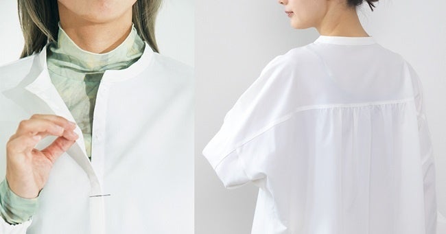 ボタンを留めるときにありがちな、かけ違いによるずれを解消するため、上から3番目のボタンの位置には刺しゅうのラインが入っています。腕を通しやすいゆったりドルマンスリーブに、位置が高めの切り替えとメリハリギャザーで美しく仕上げられた後ろ姿など、着るだけでからだをきれいに見せてくれるシルエットです。
