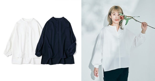 朝時間がなくて、シャツを着るのが面倒な方も着やすい、着脱が楽にできるスナップボタン仕様のシャツです。カラーは〈ホワイト〉と〈ネイビー〉の2種類があり、しわになりにくく、上品な落ち感のあるしなやかな素材は、お出かけ服にも◎。袖口はゴム入りで家事のときなどにプッシュアップしやすいなど、きちんと感と動きやすさがかなう計算されたデザインのシャツです。