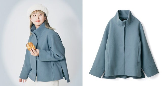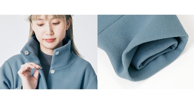 マグネットボタンが使われているので、ちょっと脱ぎ着したいときに、片手でサッと開閉できます。ふんわり軽くてあたたかなウール見えするカットソーメルトン素材にマフラーいらずのハイネック、すき間風が入りにくいリブ仕様の袖口などで寒さ対策もばっちり。