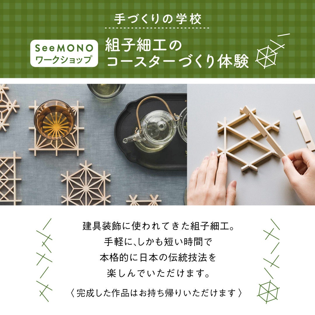 千年以上も前から建具装飾に使われてきた組子細工。釘を使わず無垢材の部品を組んで、緻密な幾何学模様を表現する伝統技法です。今回のワークショップでは組子細工のコースターづくり体験ができます。