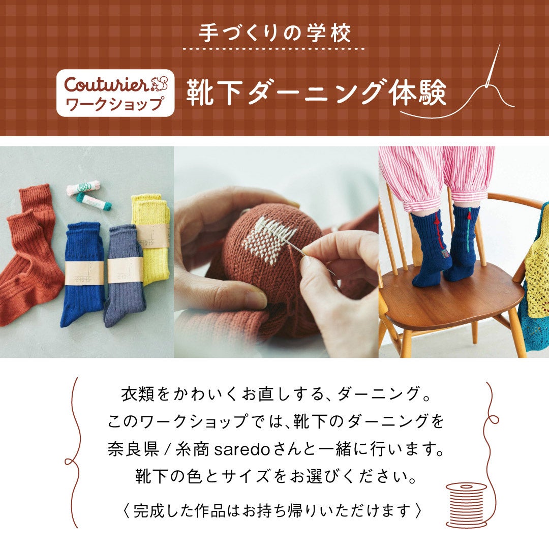 「落ちわた生まれ」の靴下にチャーミングな装飾をしてみよう!奈良県/糸商” saredo “さんと一緒に、補修するための針仕事であるダーニングを、チャーミングな装飾としてポップに楽しむ体験。ダーニング体験を通して、愛着を育て、ものを大切にする「やさしい」気持ちに!