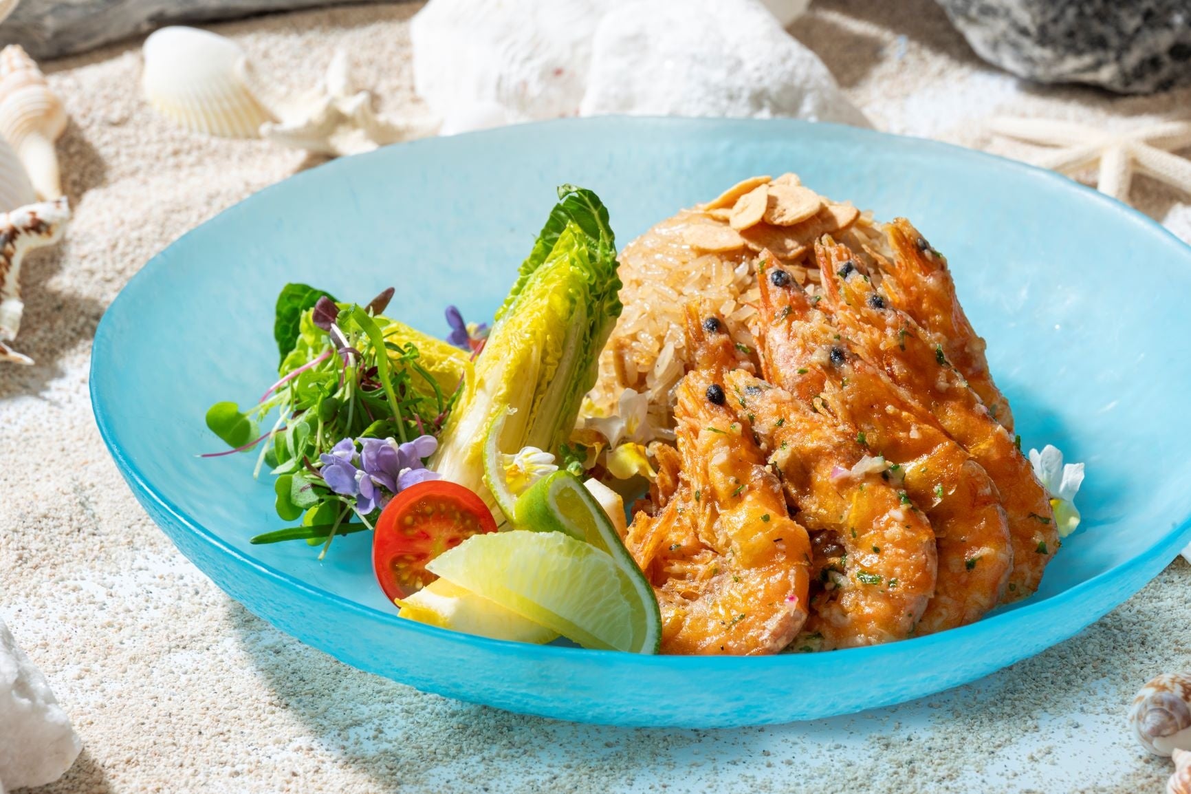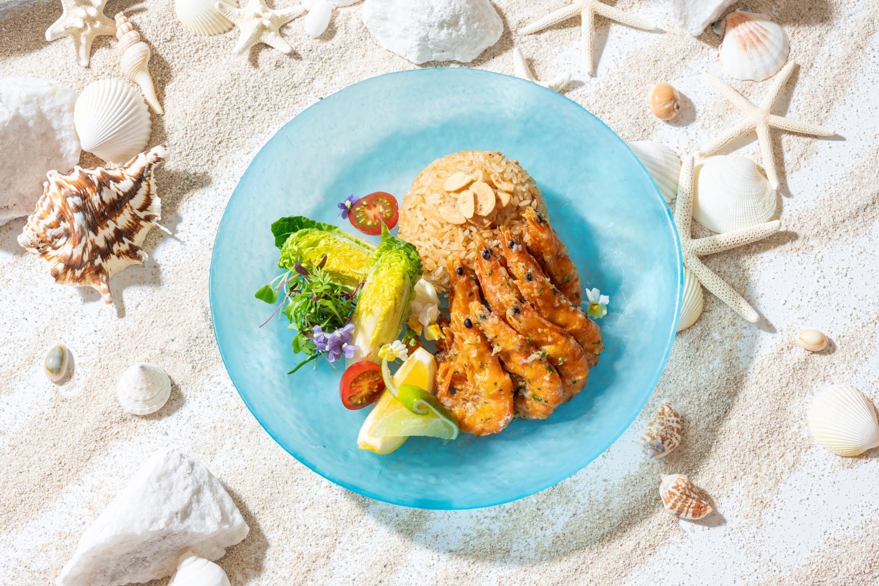 ソフトシェルシュリンプをすっぱ爽やかなレモンジュースに漬け込み、頭と尻尾までまるごと食べられるエビの唐揚げにしました。ブイヨンで炊き込みガーリックを添えたピラフの上に、ずらりとシュリンプを並べ、香りも美味しい夏のプレートに。ライムを絞って、さっぱりと召し上がれ。