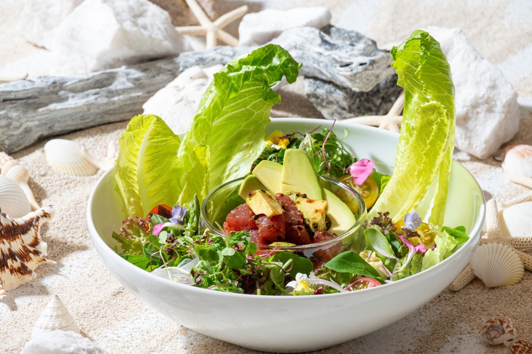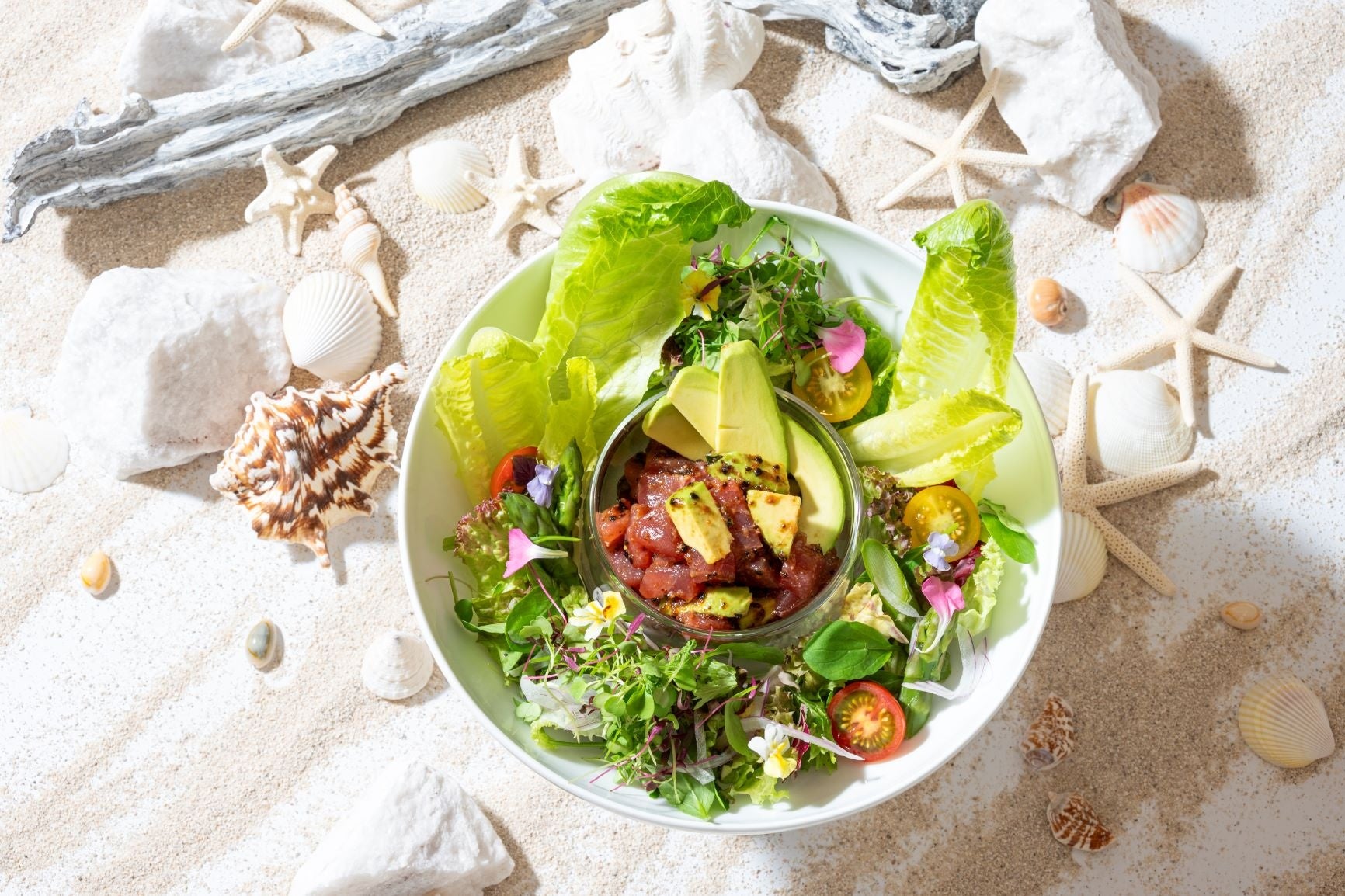 ハワイではマグロの醤油漬けを「ポキ」と呼びます。ラウンジ「エスタシオン カフェ」のポキは、細かく刻んだ昆布と醤油ドレッシングでマグロをあえて、和風の旨味とまろやかさを追加しました。マグロにアボカドとロメインレタス等を盛り付けて、野菜がいっぱいのヘルシーで旨味の強い彩りサラダに仕上げました。