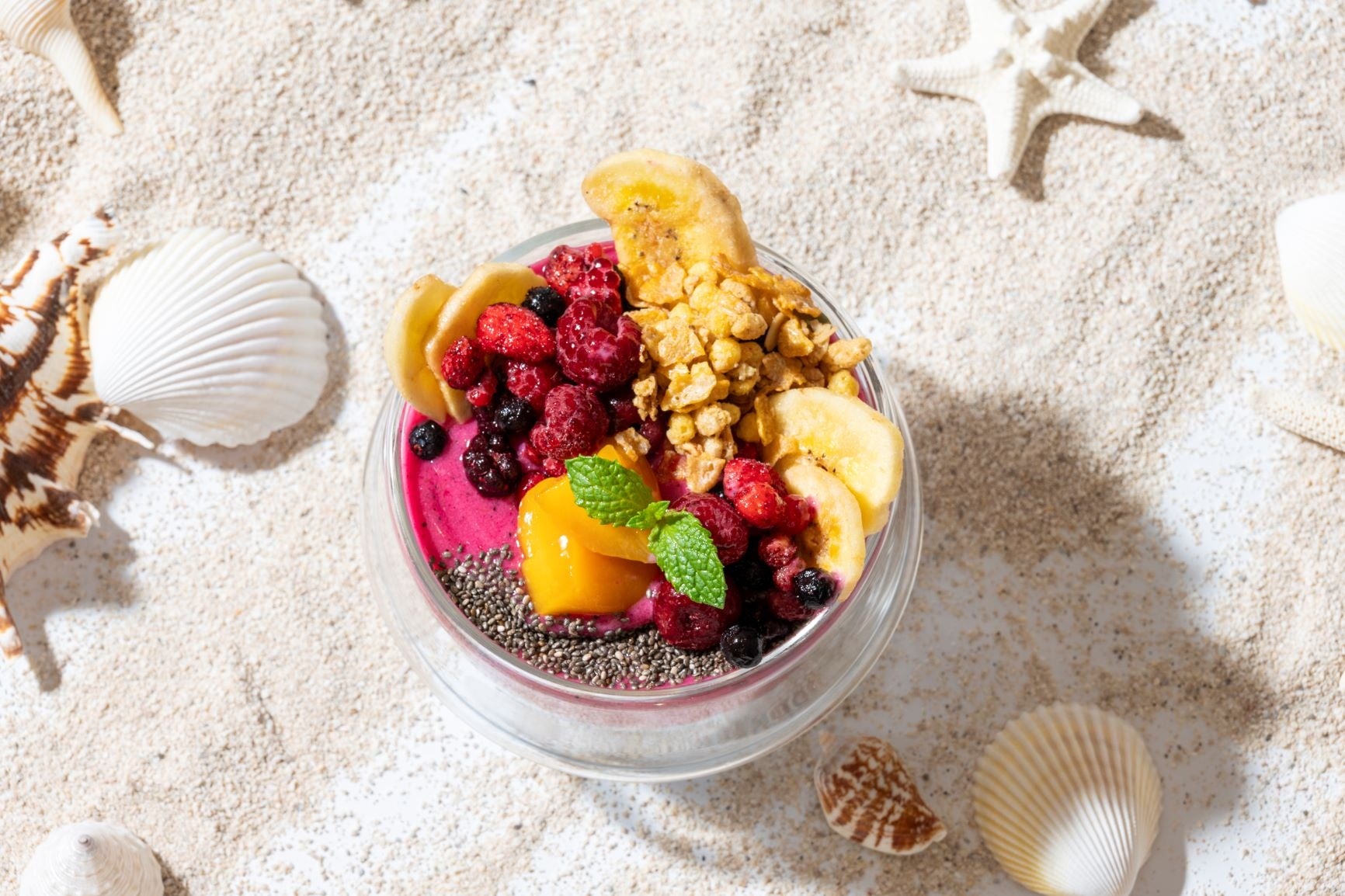 ボウルの下部には藻の一種であるブルースピルリナを混ぜ込んだ水色のヨーグルトを入れ、その上から甘酸っぱいドラゴンフルーツを混ぜたアーモンドミルクを注ぎました。上にはバナナ、パイナップル、バジルシードを可愛らしく盛りつけています。スムージーのような滑らかな喉越しで美味なのは勿論のこと、豊富な食物繊維やミネラルを含むバジルシードとフルーツで腸内環境を整える効果が期待されます。必須アミノ酸・ビタミン・ミネラル等の成分を含むブルースピルリナ入りのヨーグルトも摂取でき、健康を意識する人にも嬉しいヘルシーな南国スイーツです。