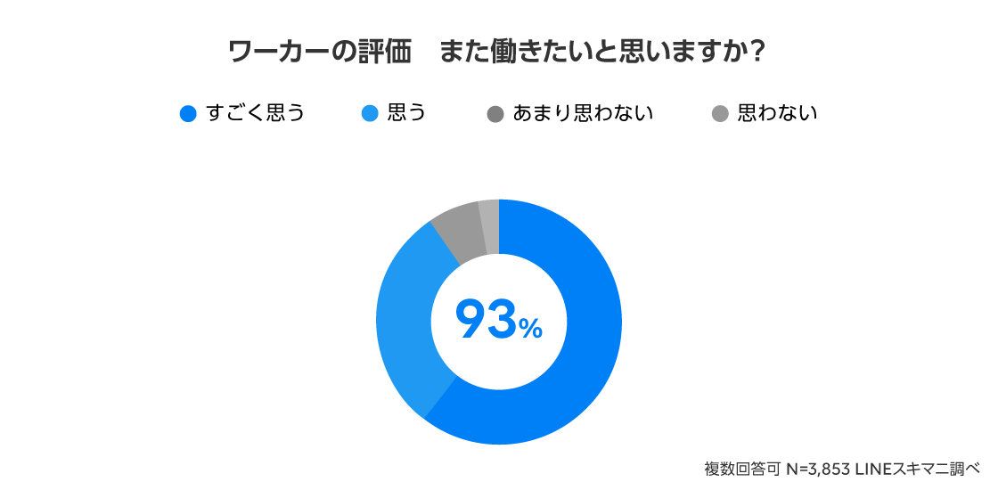 加えて、利用ユーザーに今後も「LINEスキマニ」を利用して働きたいと思うか?という質問をしたところ、「すごく思う」「思う」が合わせて93%、「あまり思わない」「思わない」が合わせて7%という結果になり、再利用の意向が高いことが分かりました。「LINEスキマニ」では、面接や書類選考が不要で、求人案件との即マッチングが成立するほか、求人への応募から最短1時間後に勤務を開始できるなど、ユーザーの“スキマ時間に働きたい”というニーズを満たすサービスの特徴が、再利用の意向につながっているとうかがえます。
