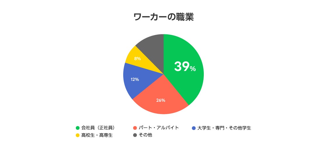 利用ユーザーにおいては、年齢は20代が30%と最も多く、次いで40代が24%、30代が18%でした。職種で見ると、会社員が最も多く39%、次いでパート・アルバイト(フリーター)が26%、大学生・専門・その他学生が12%となっています。