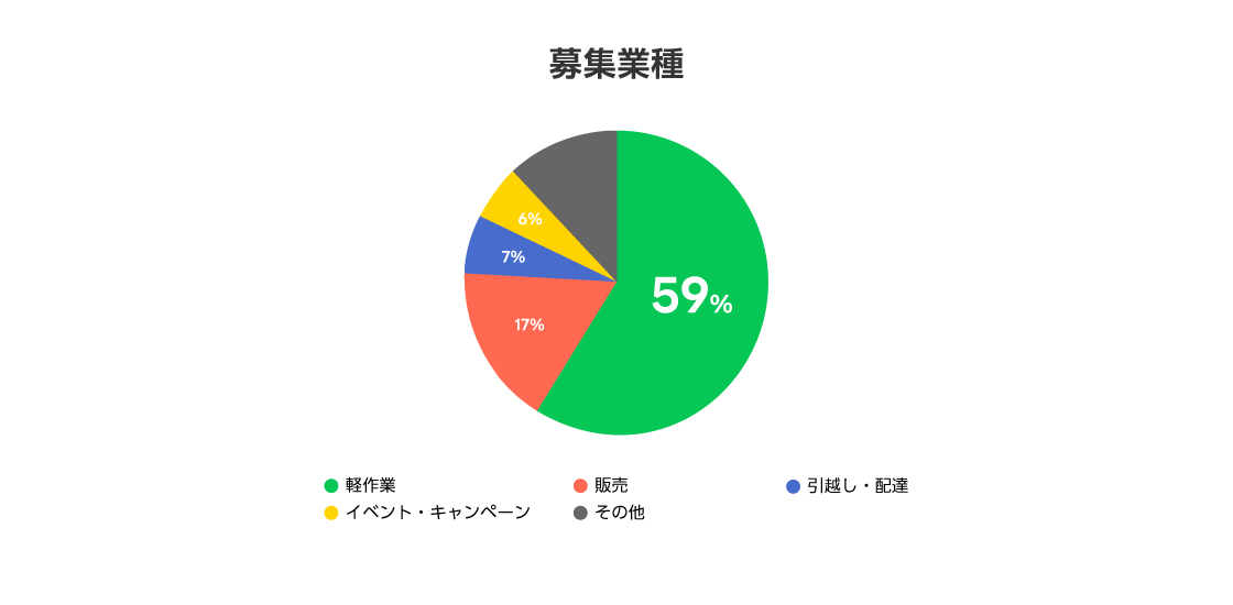 また、求人掲載店舗数が前年比で約20倍に拡大しているほか、募集職種は、軽作業が59%と半数以上を占め最も多く、次いで販売が17%、引越し・配達が7%と続く状況となっています。