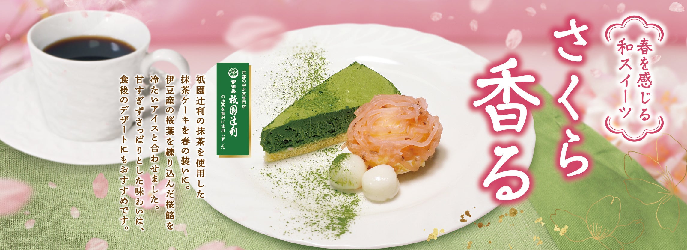 衹園辻󠄀利の抹茶を使用した“抹茶ケーキ”に伊豆産の桜葉を練り込んだ桜餡を冷たいアイスと合わせ、