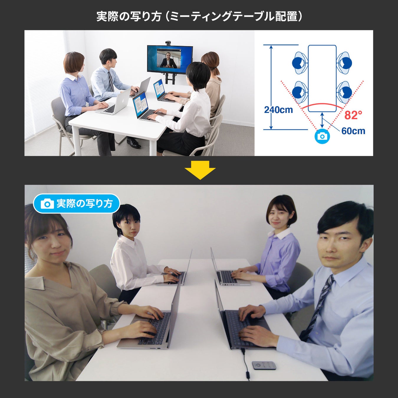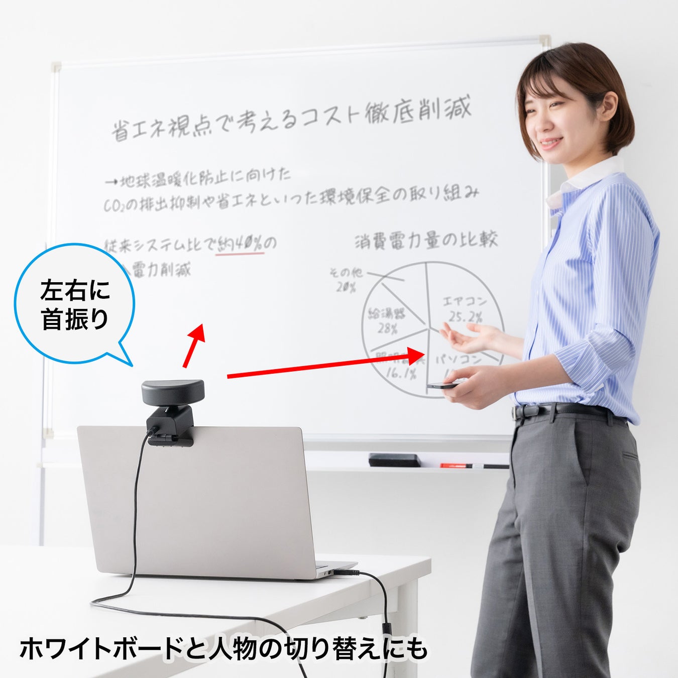 付属のリモコンでカメラの向きを水平方向100°の範囲で動かしたりズームしたりできます。複数人で打ち合わせをする時でも発言者にカメラを向けられるので、誰が発言しているか一目で分かります。オンライン会議・授業などでは、黒板やホワイトボードと人物の切り替えもリモコン操作ででき便利です。声をしっかり拾うマイクも内蔵しています。