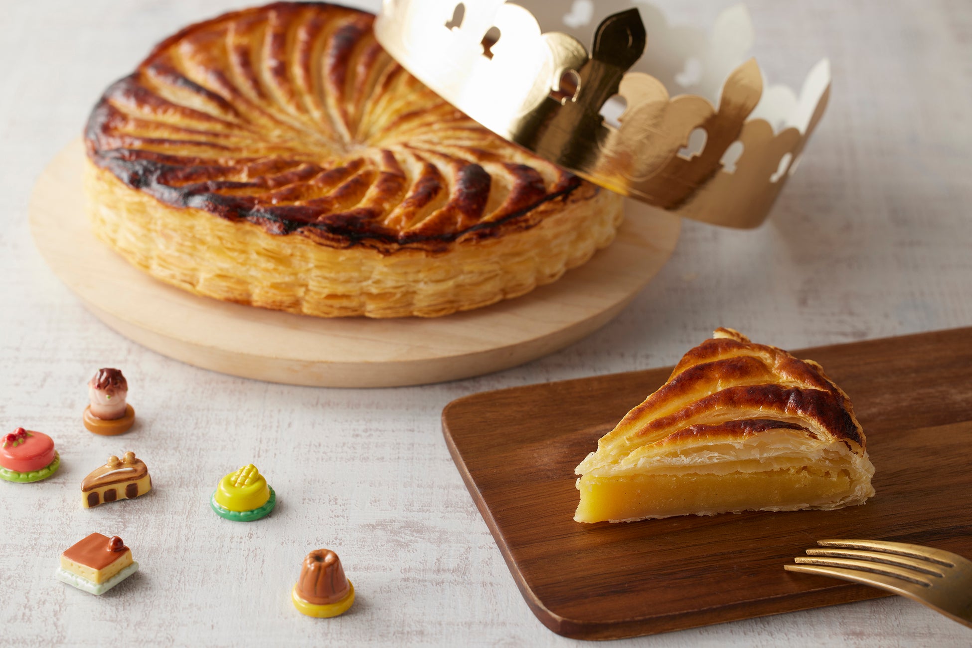 「ガレット・デ・ロワ」は、フランス語で「王様のお菓子」を意味し、新年の家族や友人との団欒の時間に食される特別なお菓子です。一般的に、パイ生地の中にアーモンドクリームが入っており、「フェーブ」と呼ばれる陶器で作られた人形が一つだけ生地に隠されています。この「フェーブ」が入ったピースを当てた人は王冠を被り、皆から祝福され、一年間幸福になると言われています。