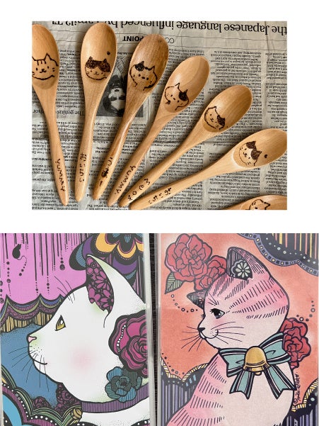シマエナガ&ニャンコの木製カトラリーやハンドメイドの猫ブローチ、アクセサリーなど、ここでしか手に入らないグッズを多数取り揃えました。