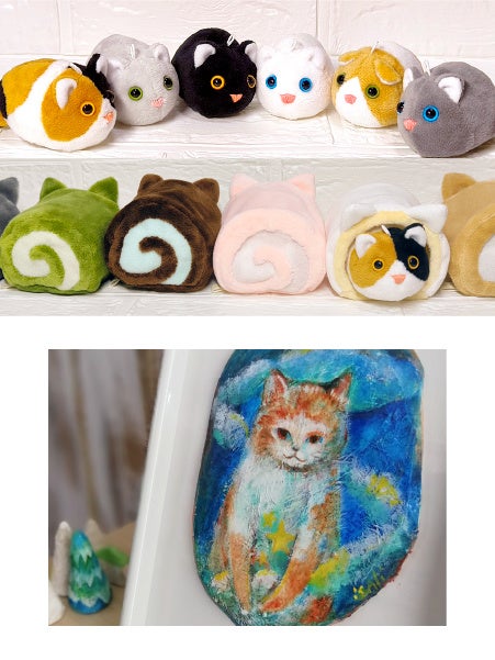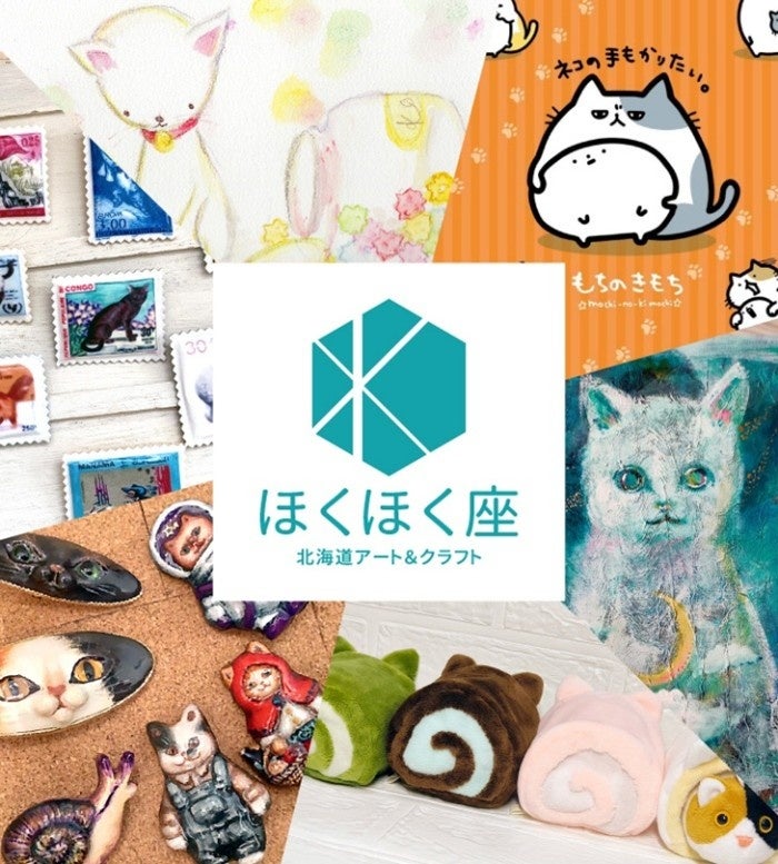 北海道の人気クリエイター6名による猫作品やにゃんこ1点グッズを販売。ぬいぐるみ作家お手製の「推しのぬいぐるみが入れられる猫耳ロールケーキぬいぐるみ」や、人気イラストレーター「ゴトウマキエ」によるマヌル猫グッズは必見です。