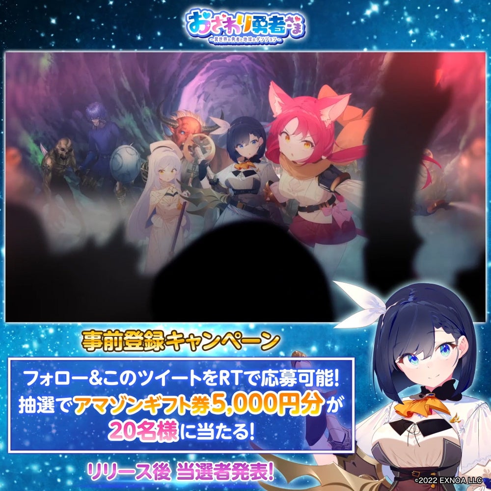 個性豊かな勇者たちと一緒に異世界に繋がるダンジョンを攻略するPC/スマートフォンブラウザ向けカジュアルRPG『おさわり勇者さま』の事前登録開始を記念して、抽選で20名様に5,000円分のAmazonギフトコードが当たるフォロー&RTキャンペーンやゲーム正式サービス時にキープした勇者さまをもらえる事前登録ガチャなど様々なキャンペーンを開始しました。