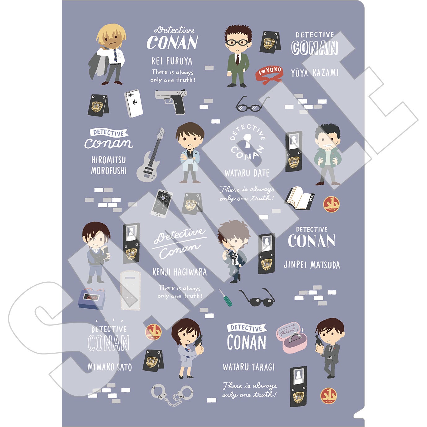 今回登場する『名探偵コナン』のデザインは2種類。1つは江戸川コナンや毛利蘭はもちろん、赤井秀一、安室透、怪盗キッドなど個性的なキャラクターたちが盛り込まれたデザイン。もう1種類は警察関係のキャラクターたちが盛り込まれたデザインです。それぞれキャラクターにちなんだ小物も多数描き起こされており、作品の世界観を大切にしつつ「ゆるパレット」ならではのイラストタッチで表現されたデザインは、日常使いしやすいのも大きな魅力の一つ。